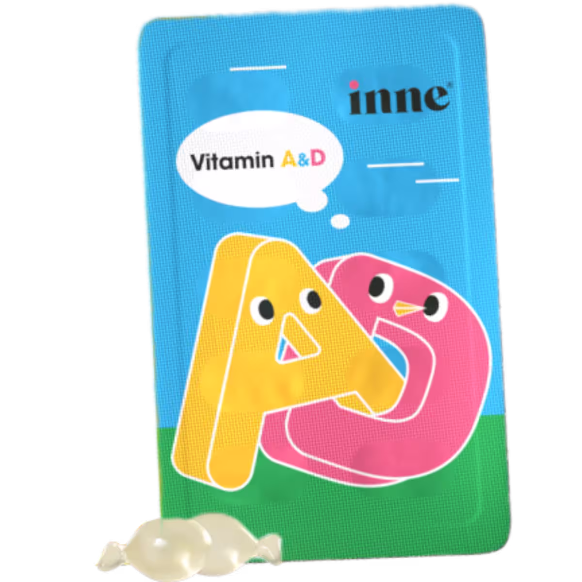 inne® VITAMIN A&D is a food supplement for children which is good for growth and development of children. Each softgel contains 1500 IU of Vitamin A and 500 IU of Vitamin D.